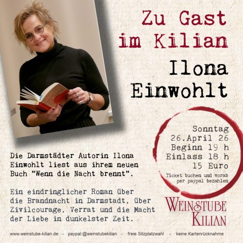 Die in Darmstadt lebende Autorin Ilona Einwohlt ist zum ersten Mal bei uns in der Weinstube zu Gast. Sie liest an diesem Abend aus ihrem neu erschienenen Roman „Wenn die Nacht brennt“.